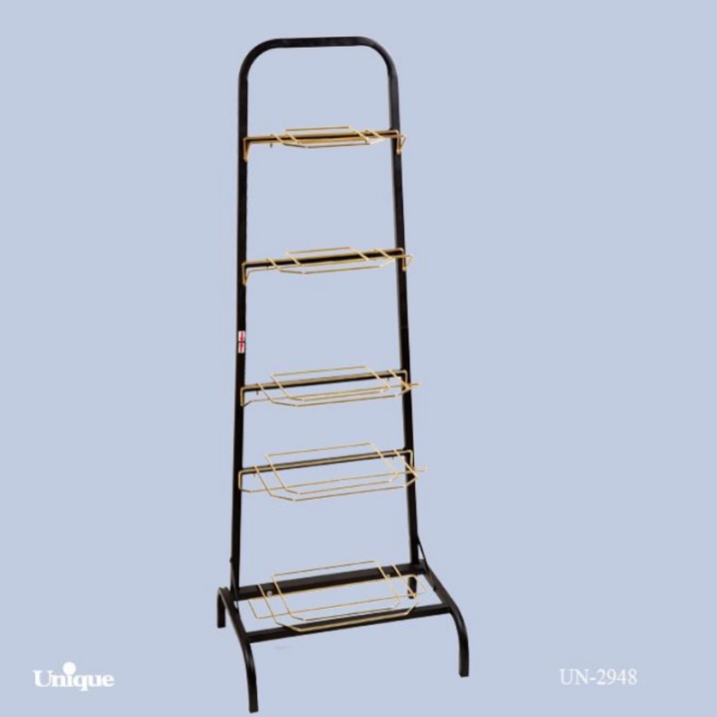 استند شیک و مقاوم با ۵ طبقه جادار برای انواع قابلمه و تابه. طراحی مستحکم و زیبا با ترکیب رنگ مشکی – طلایی. صرفهجویی در فضا و مناسب برای هر آشپزخانهای.